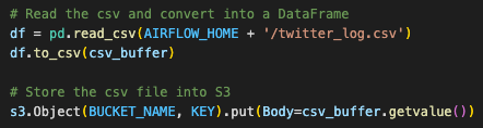 - Read the csv using Pandas library and store the data into S3 by calling boto3.Session.resource.Object.put()